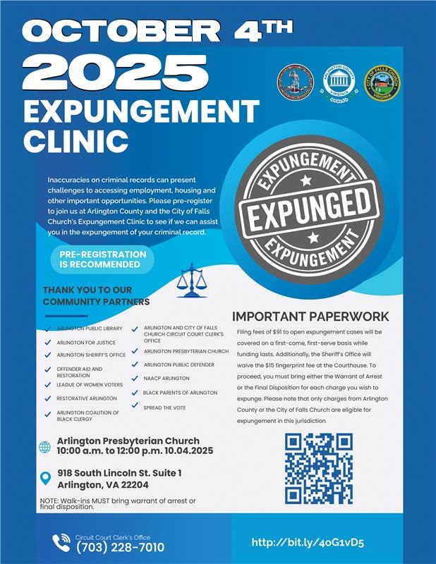 Filing fees of 591 to open expungement cases will be covered on a first-come, first-serve basis while funding lasts. Additionally, the Sheriff’s Office will waive the Sis fingerprint fee at the Courthouse. To proceed, you must bring either the Warrant of Arrest or the Final Disposition for each charge you wish to expunge. Please note that only charges from Arlington County or the City of Falls Church are eligible for expungement in this jurisdiction